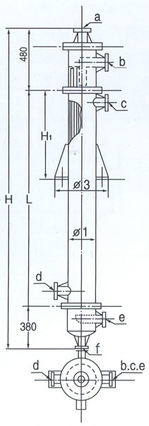 d-冷却水进 e-尾气出口 f-成品出口